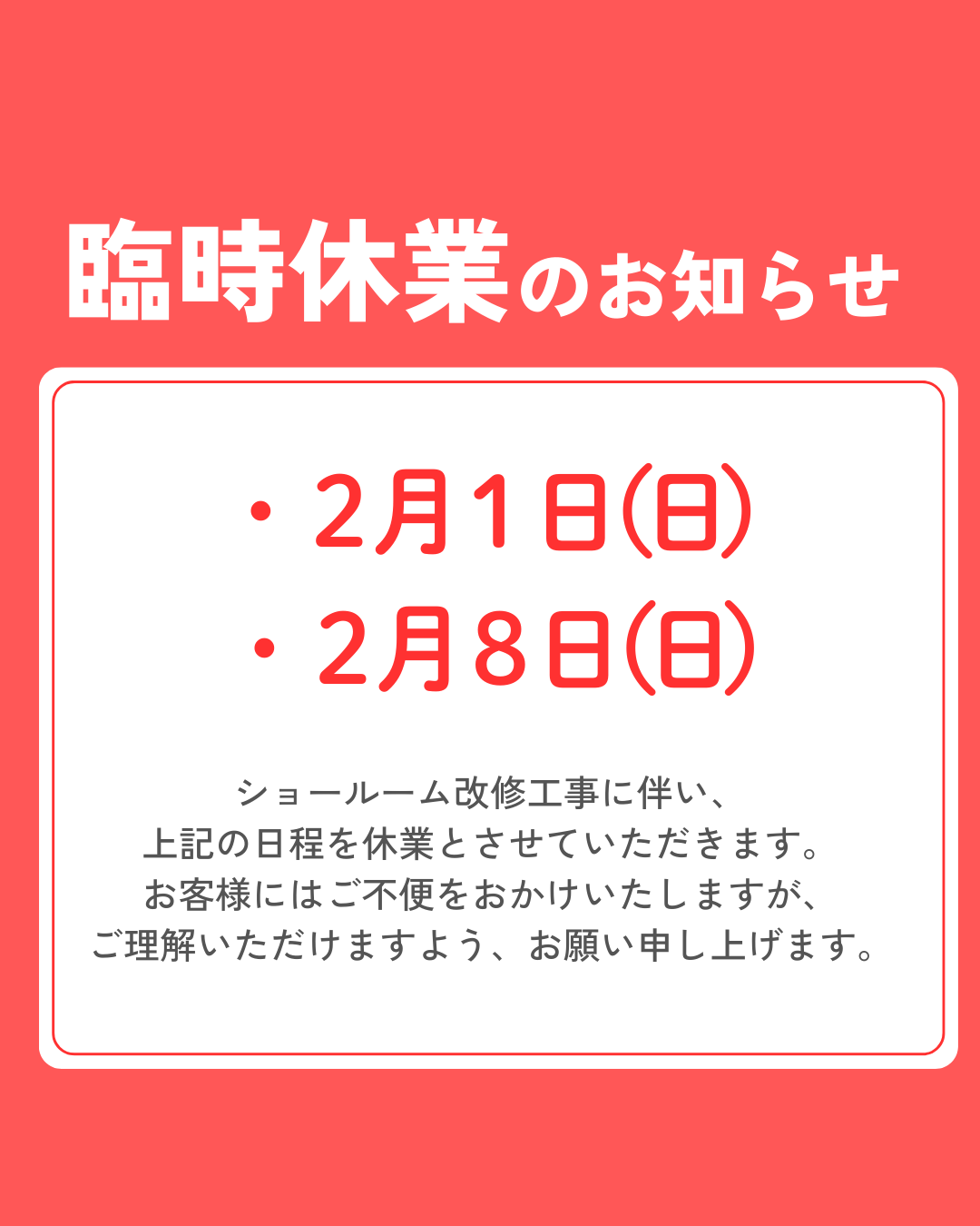 誠に勝手ながら、ショールーム改修中のため、下記日程は臨時休業とさせていただきます。